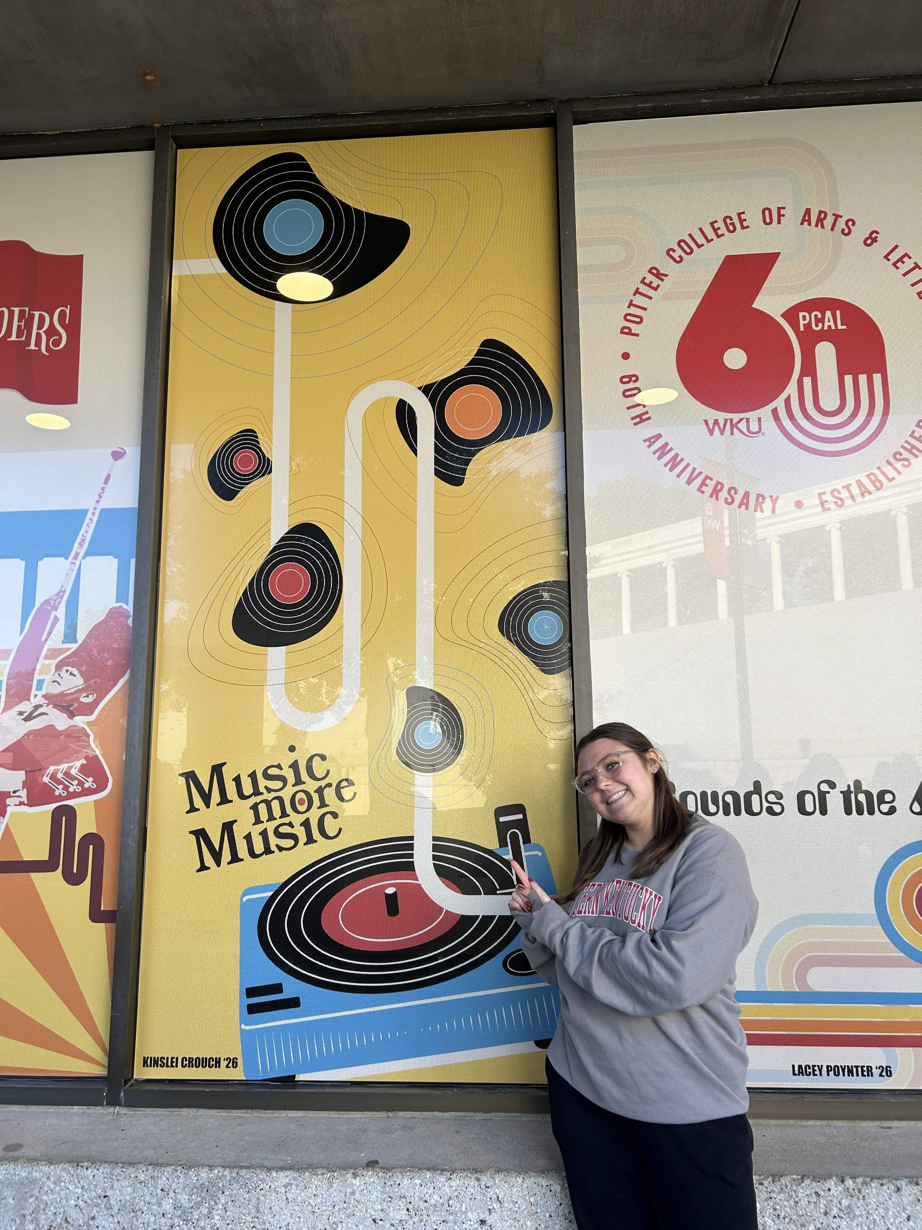 My Digital Illustration class had the opportunity to design 60th anniversary windows for the Potter College of Art and Letters at WKU. The theme was 'Sounds of the 60s' and we were challenged to create a design to represent the theme that would be installed as a vinyl piece to be presented on prominent windows outside the building. My design below was chosen with 5 other students to celebrate this occasion.
